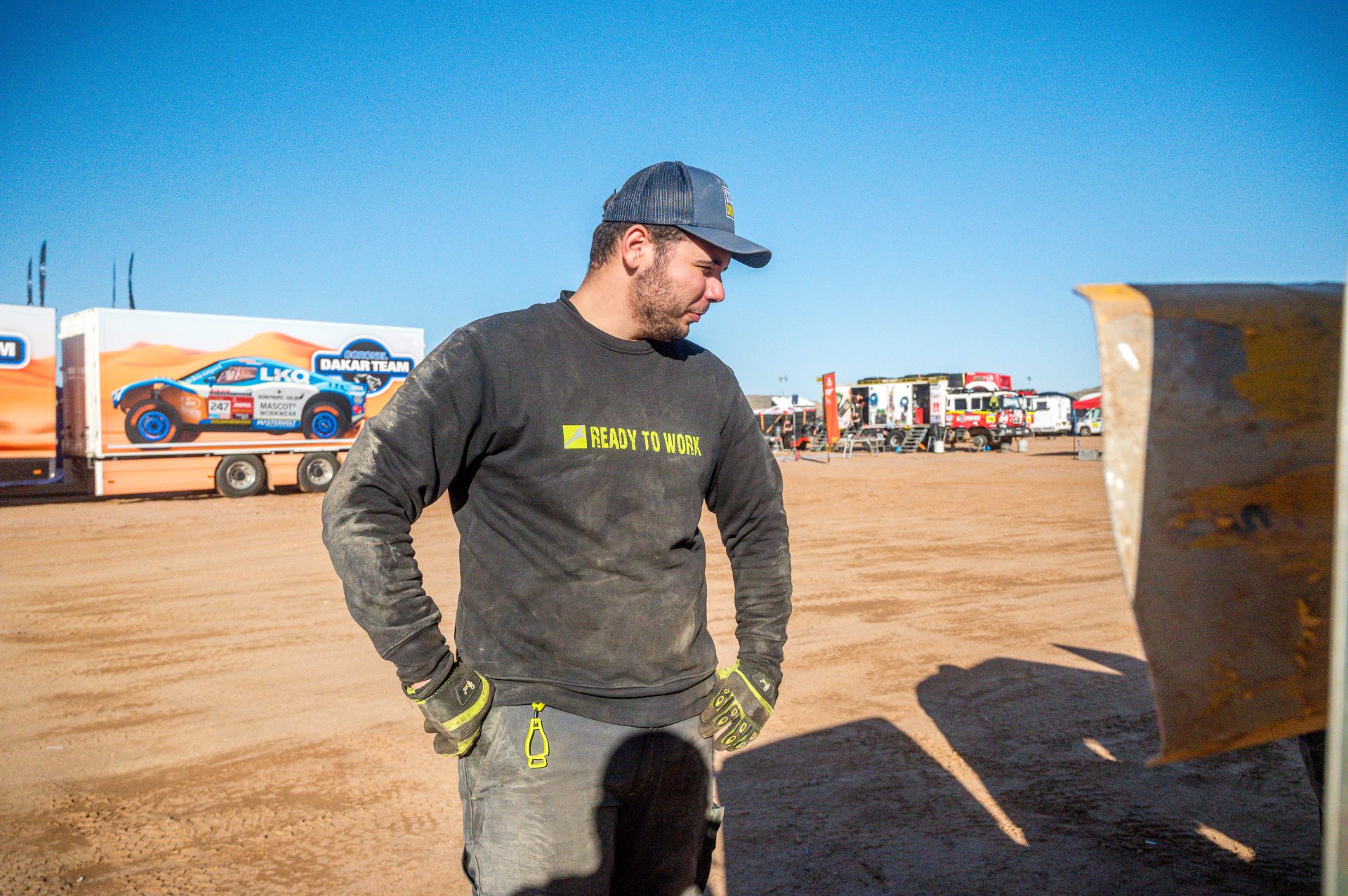 Pracovní oblečení je součástí našich životů, alespoň v průběhu nejnáročnější Rally světa Rally Dakar – tak to prostě je. Dakarské depo nabízí široký sortiment oblečení, doplňků a nejrůznějších vychytá vek pro pohodlí jezdců, ale hlavně pro mechaniky. Nejdůležitějším cílem je bezesporu funkčnost a odolnost oblečení. Které mnohdy prochází opravdovým „Armagedonem“. Ono když vám přiletí auto obalené od bahna, rozbité ze všech stran v deset v noci, a k tomu je venku okolo nuly a lije jako z konve. Tak v ten moment už oblečení musí být kované!