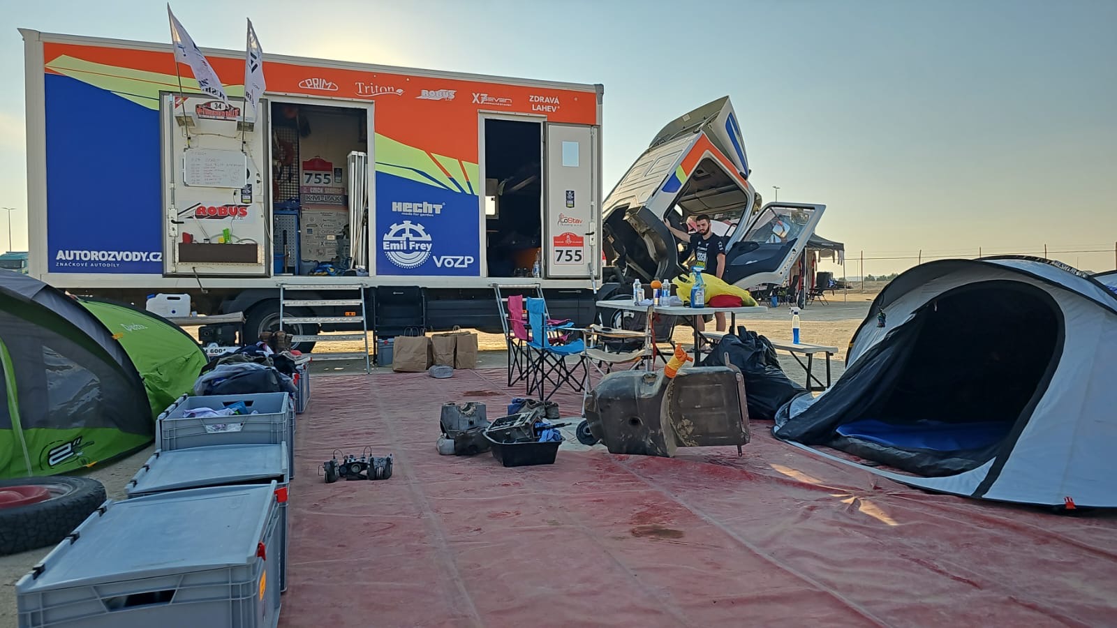 Napilno měl i Tomás Neruda, šéfmechanik servisu Citroënu 2 CV: „Včerejší den byl velmi náročný, ale bojujeme a holky mi dělají radost. Když dnes jely maratonskou etapu, tak jsme s Honzou Pavlíkem kompletně přeskládali doprovodné Atego. Udělali údržbu a pak jsme netrpělivě čekali na holky až dorazí z etapy.“