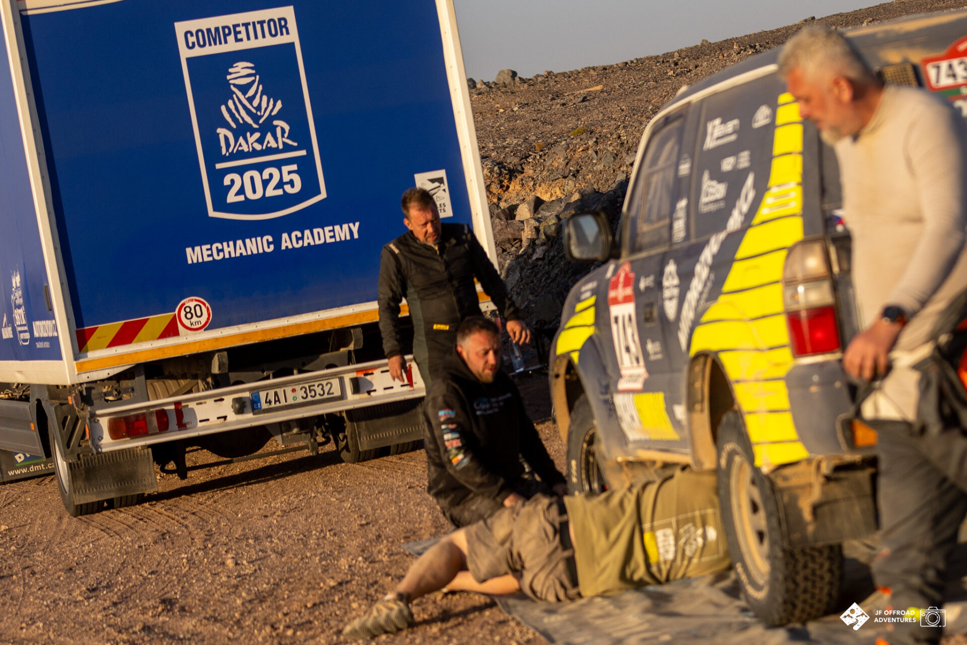 „Bylo jasné, že kluci s takto poškozeným autem nemohou závodit, ale pouze někam dojet, kde budou vůz opravovat. Pomáhá velká spousta lidí. Za což všem moc děkujeme. Je vidět, že dakarská rodina je opravdu velká, a když je třeba, tak si navzájem pomohou. Nádrž se hledala všude, i přes českou ambasádu, zjjišťovaly se kontakty na servisy v dané oblasti, sháněl se plátovací plech atd. Bylo to hektické a věřím, že se podaří nakonec dojet do bivaku a pokračovat i se spožděním v soutěži,“sdělila manažérka týmu Ollie Roučková.